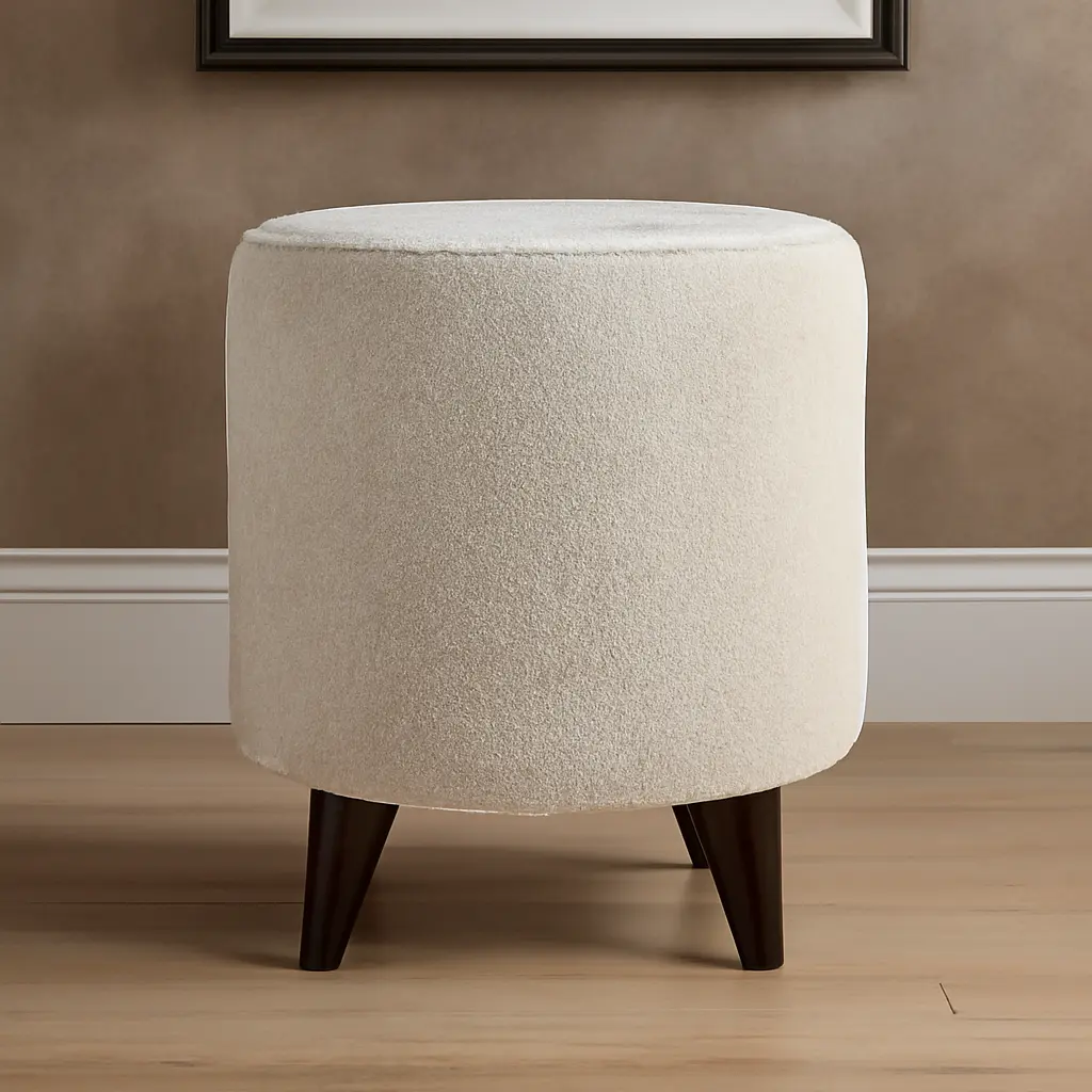 Add a sense of elegance and comfort to your living space with this brand new round ottoman from Asghar Furniture. This simple yet stylish piece will enhance your living space with its soft Boucle fabric upholstery, round design, shiny touch of wood at the base, and compact size. It will be your magical extra seating, a footrest, or a table alternative.