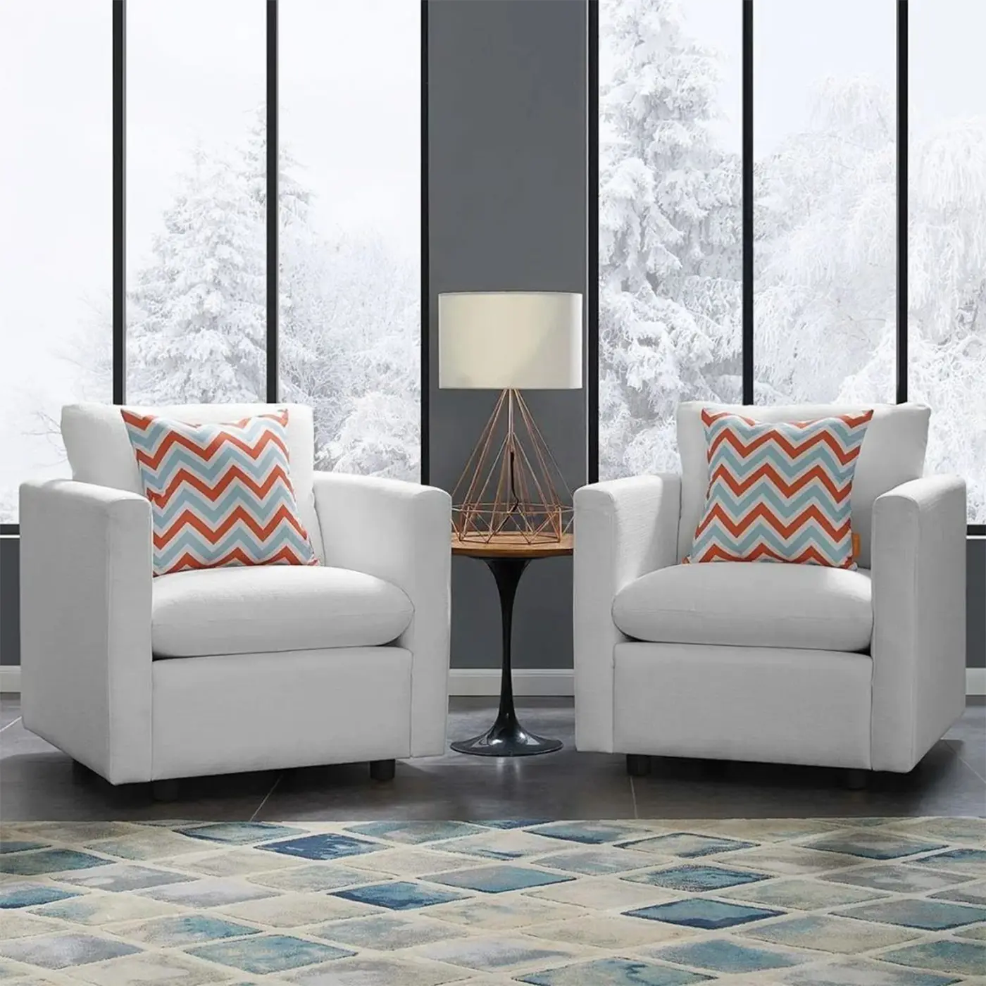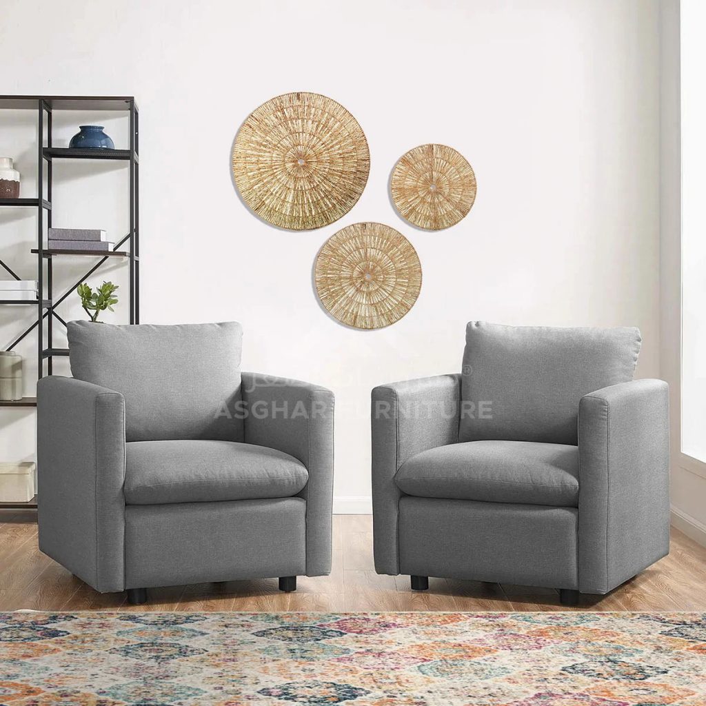 Harper Upholstered Arm Chair Set, A versatile addition to a family room, apartment, office, or small living space, Harper is a cozy modern chair set. upholstered in soft fabric, and short wooden legs that give a unique touch to this set of the armchair.