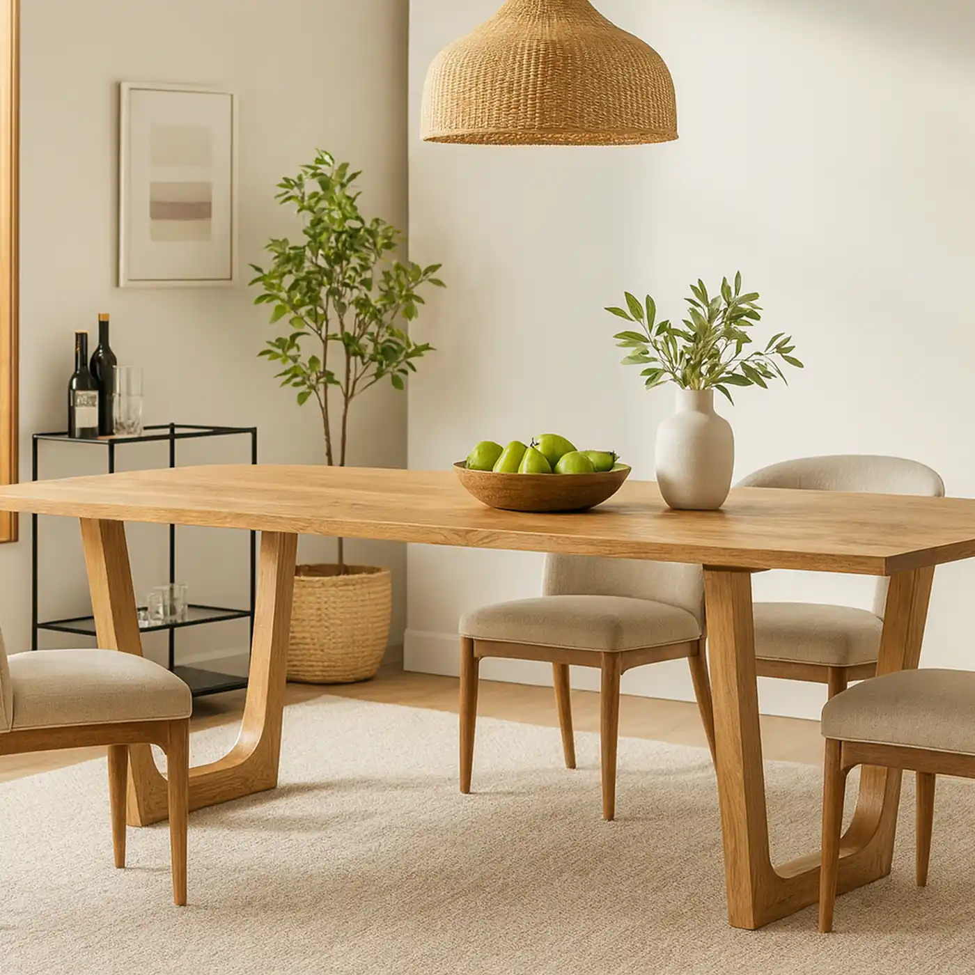 The Birke Dining Table showcases a engineered-wood top with sculpted U-frame legs, blending modern Scandinavian design with natural warmth. Crafted for durability, elegance, and minimalist interiors, it’s perfect for contemporary dining rooms seeking clean lines and organic character.
