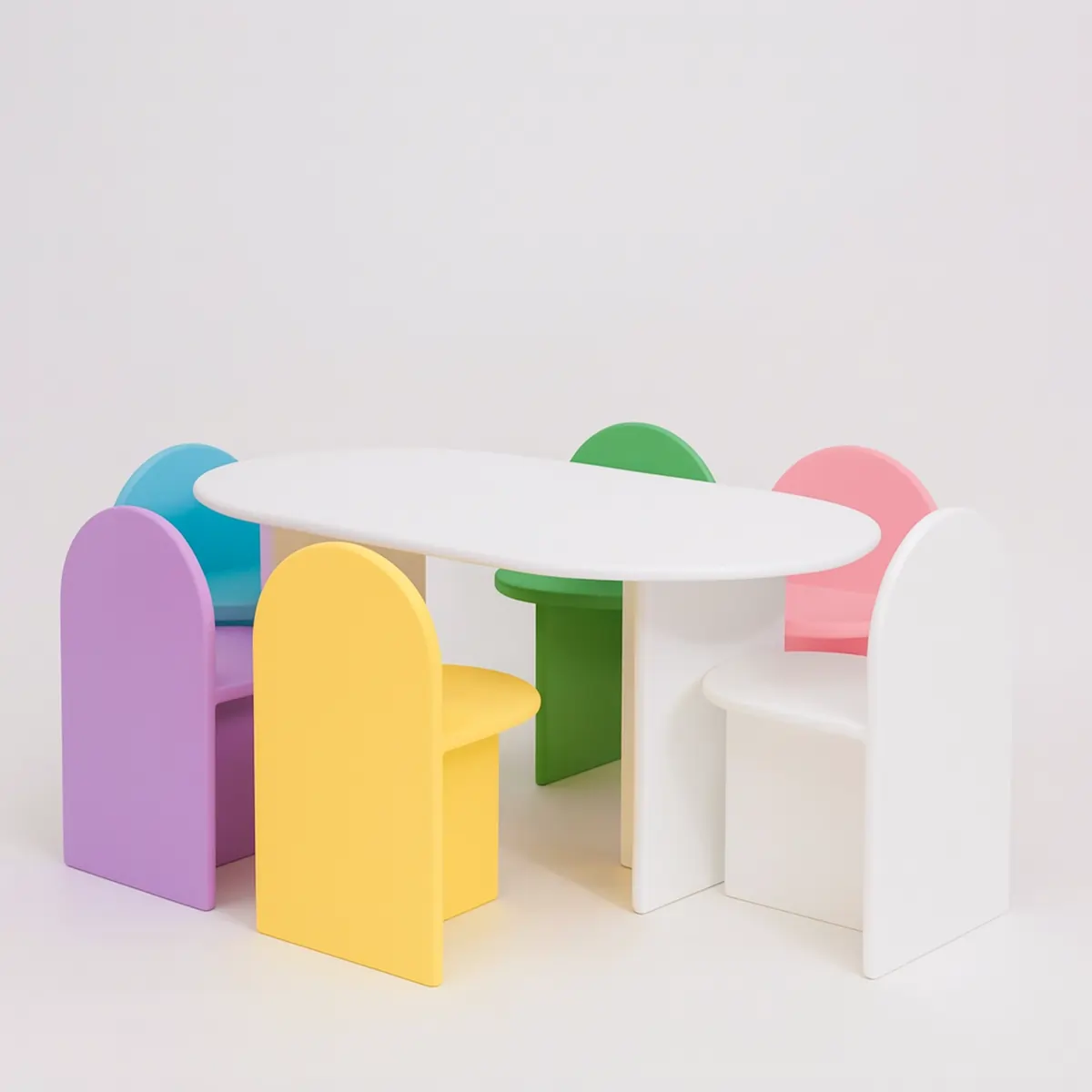 The TinyArc Kids Table Set pairs a smooth oval table with colourful arch-back chairs, creating a safe, child-friendly space for learning, crafts, and play. Its rounded edges, sturdy construction, and pastel design make it an ideal activity set for modern playrooms, nurseries, and preschool environments.